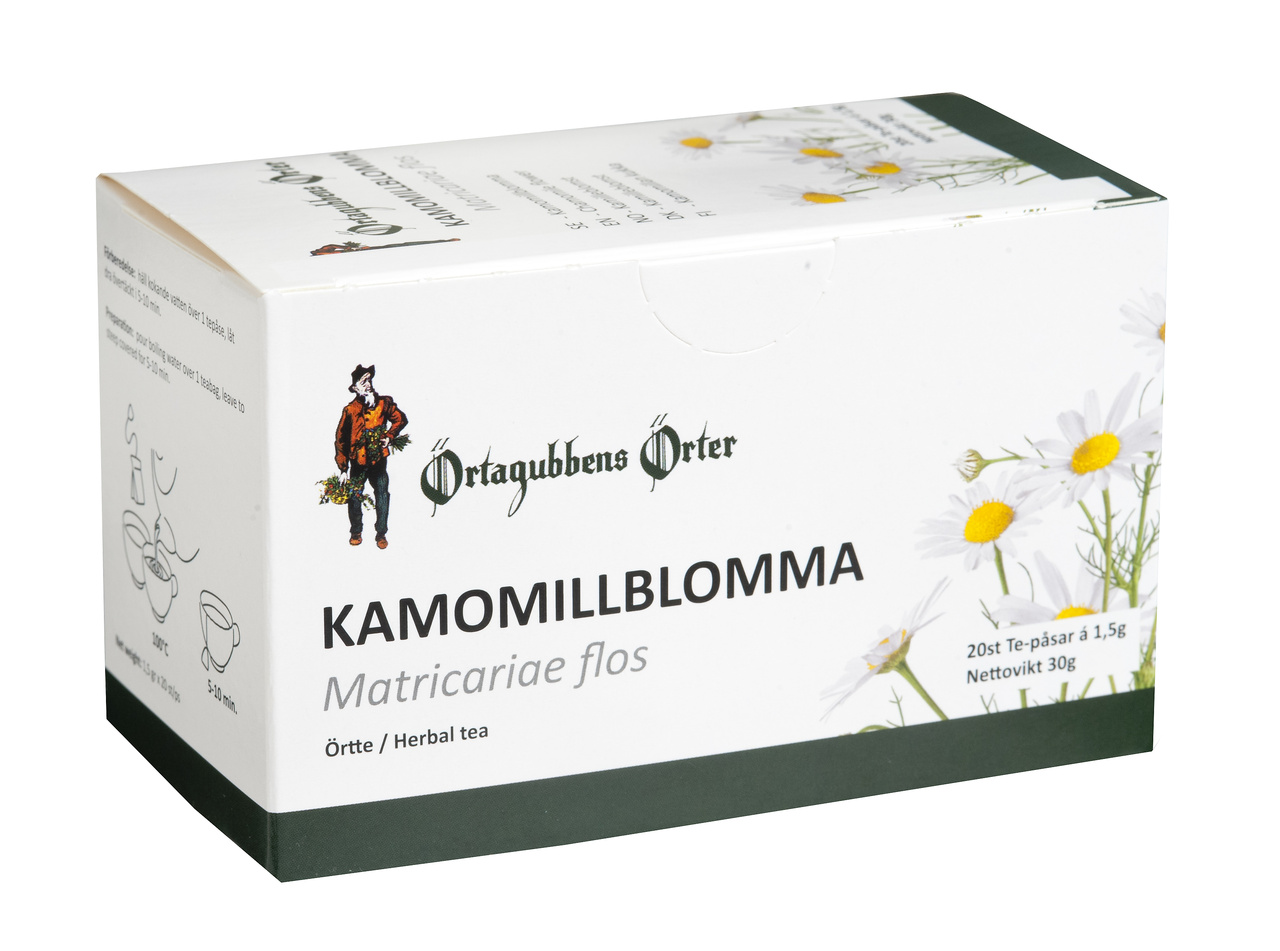 Örtagubben Kamomill (Matricaria flos) har en aromatisk doft och en milt bitter smak som många uppskattar. Kamomill är en välbekant blomma i den svenska floran, och en vanlig ört att använda i örtteer.